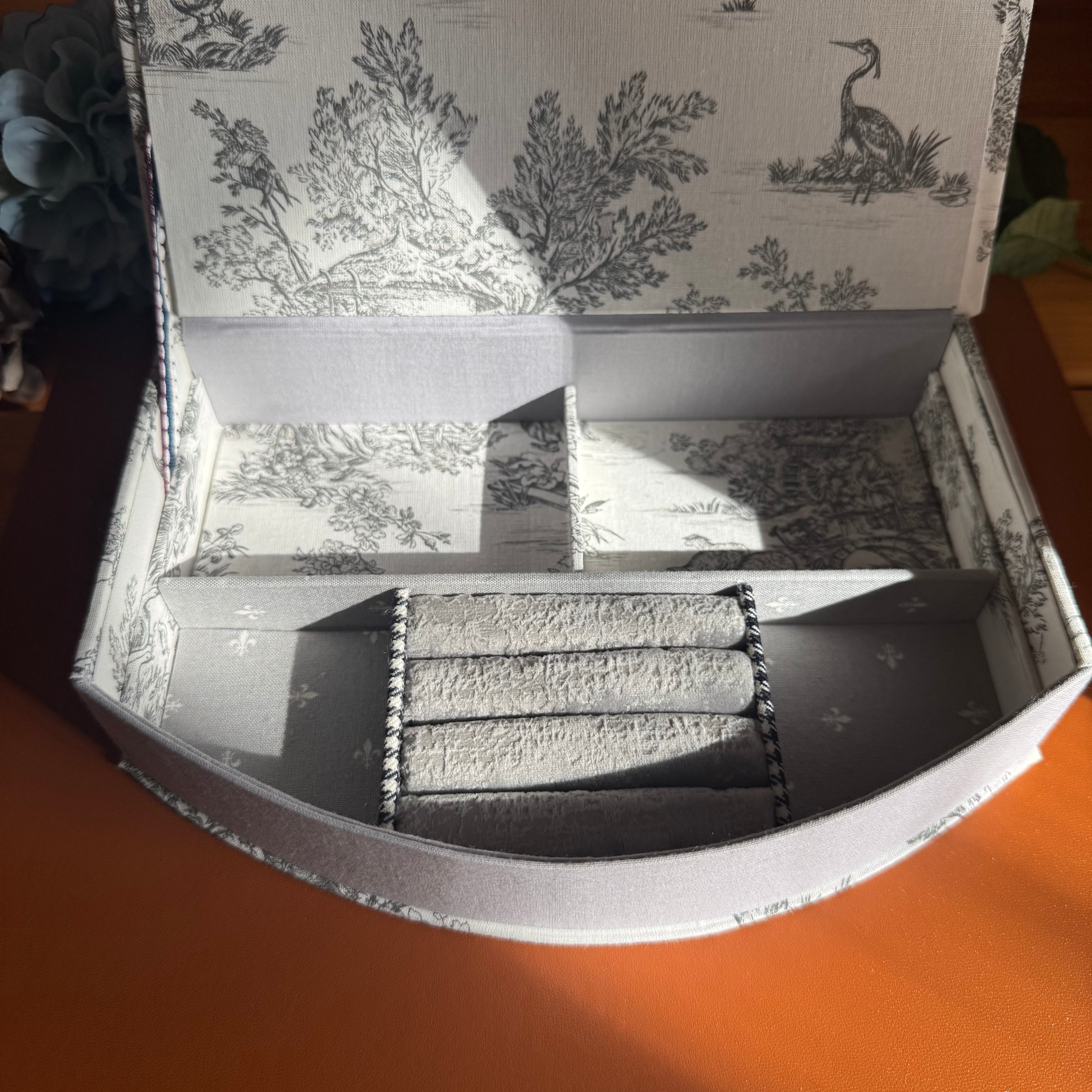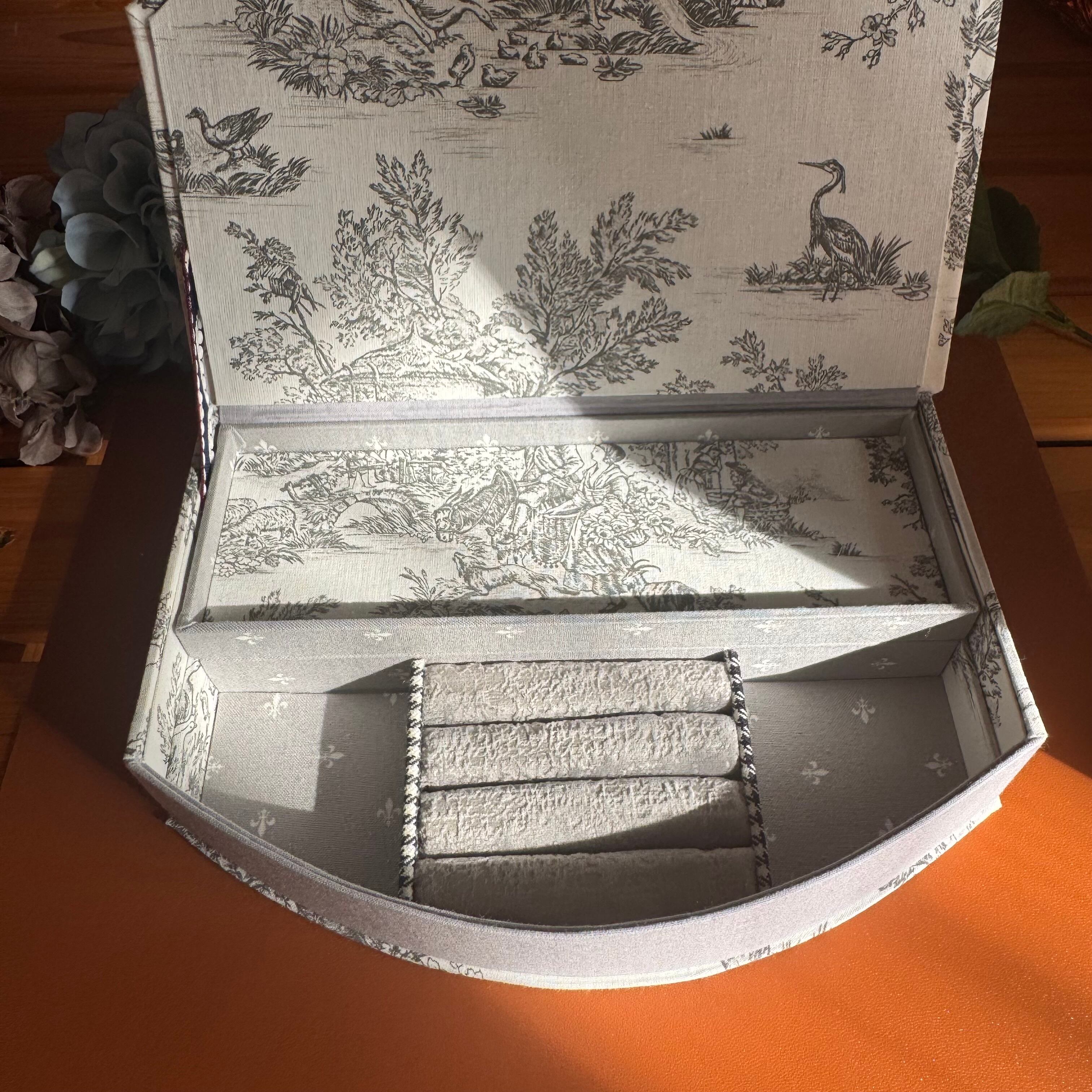 優雅なトワルドジュイのデザインが施されたアクセサリーケースは、2段タイプで機能性も抜群です。洗練されたグレーの配色がどんなインテリアにもマッチし、大切なジュエリーをスタイリッシュに収納することができます。このケースは、特別な日の贈り物や自分自身へのご褒美としてもおすすめのアイテムです。